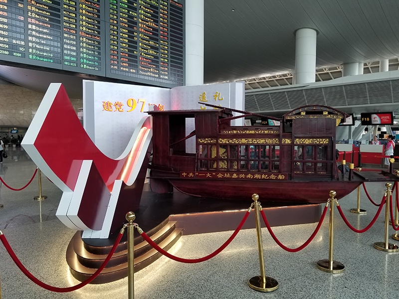 2018年7月1日,為紀念建黨97周年,傳承和弘揚紅船精神,航站區中心在T3航站樓出發層11號門對面空地引入“南湖紅船”模型,并對周邊場地進行美化布置,讓過往旅客感受新時代背景下“干在實處、走在前列、勇立潮頭”的浙江精神,深刻體會紅船精神的偉大意義,為航站樓積極營造文化氛圍添上濃厚的一筆“中國紅”,吸引旅客紛紛拍照留念。