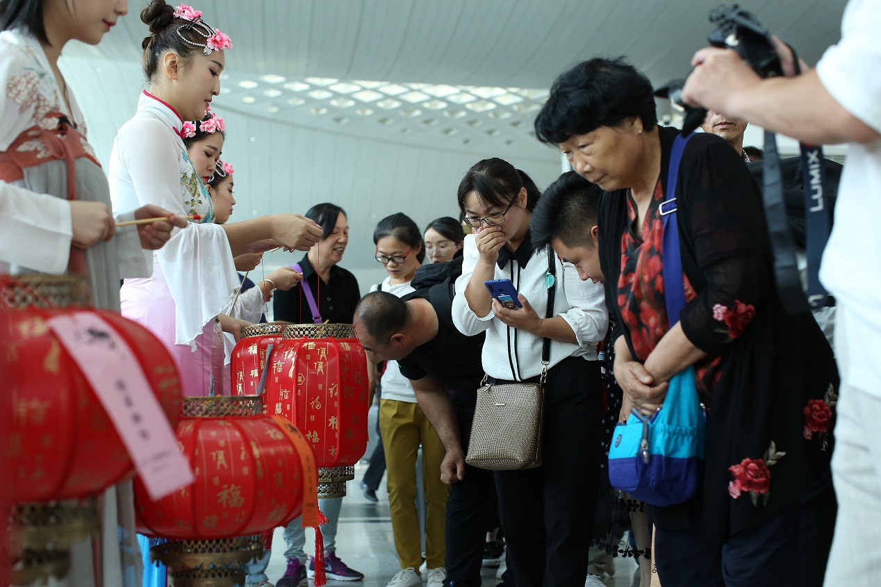 9月13日上午,在T1航站樓9號門旁開展了“情系空港,愛滿中秋”文化活動。活動圍繞嫦娥奔月、月圓團聚等中秋文化元素,以回歸傳統、弘揚民俗為立足點,為旅客呈現了精彩的中秋歌舞表演,并與旅客進行了“彩繪月兔”、“猜燈謎”等互動活動。航站樓內洋溢著傳統節慶氛圍,為旅客的中秋旅途增加了濃厚的文化體驗。