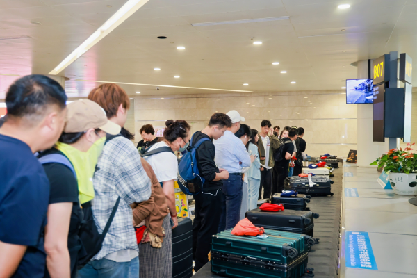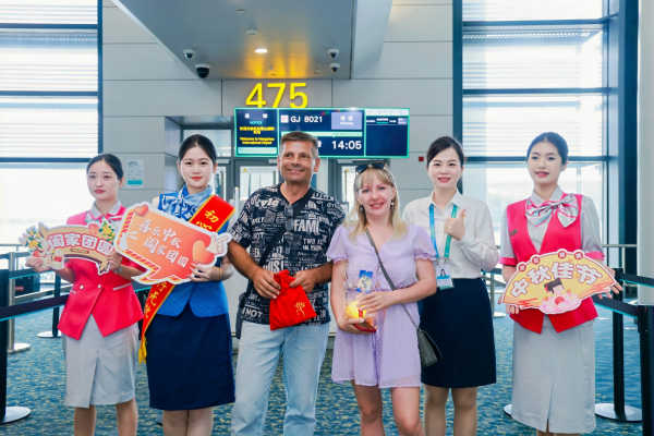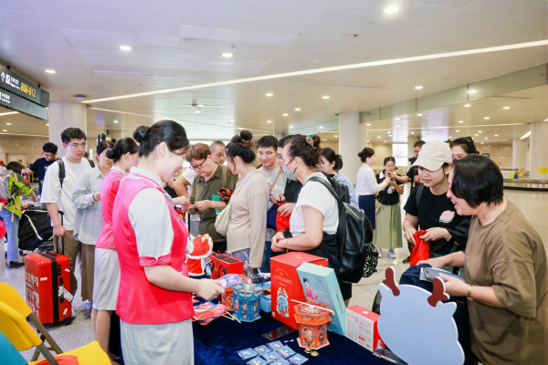 下午,活動移場至T4國際出發475機位。航站區中心與浙江長龍航空選取GJ8021作為“天命人”中秋出港航班,在廊橋側共為110位旅客贈送中秋福袋。