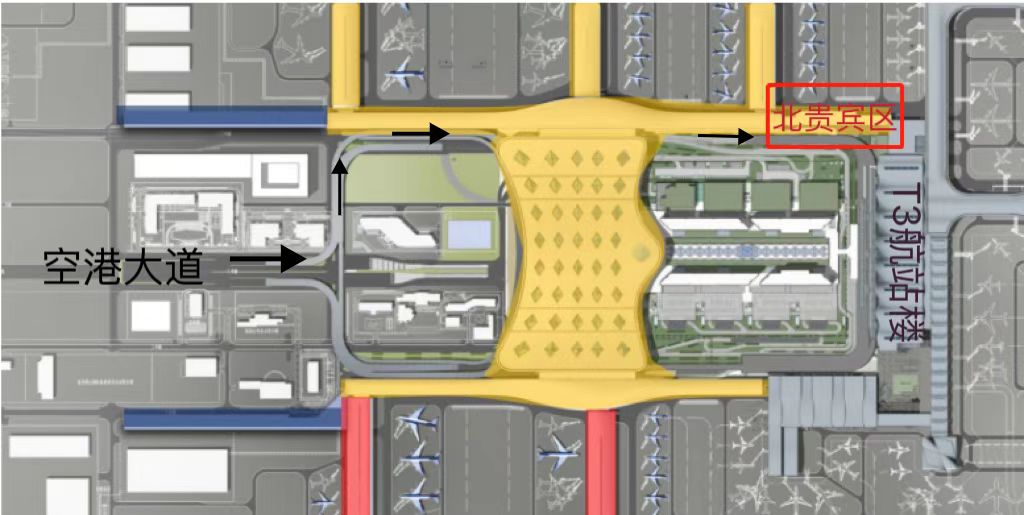 【機場大巴】T3航站樓出發層下車,進入航站樓乘電梯下至一樓。從14號門出航站樓,右轉直行到底,再左轉進入北貴賓區。