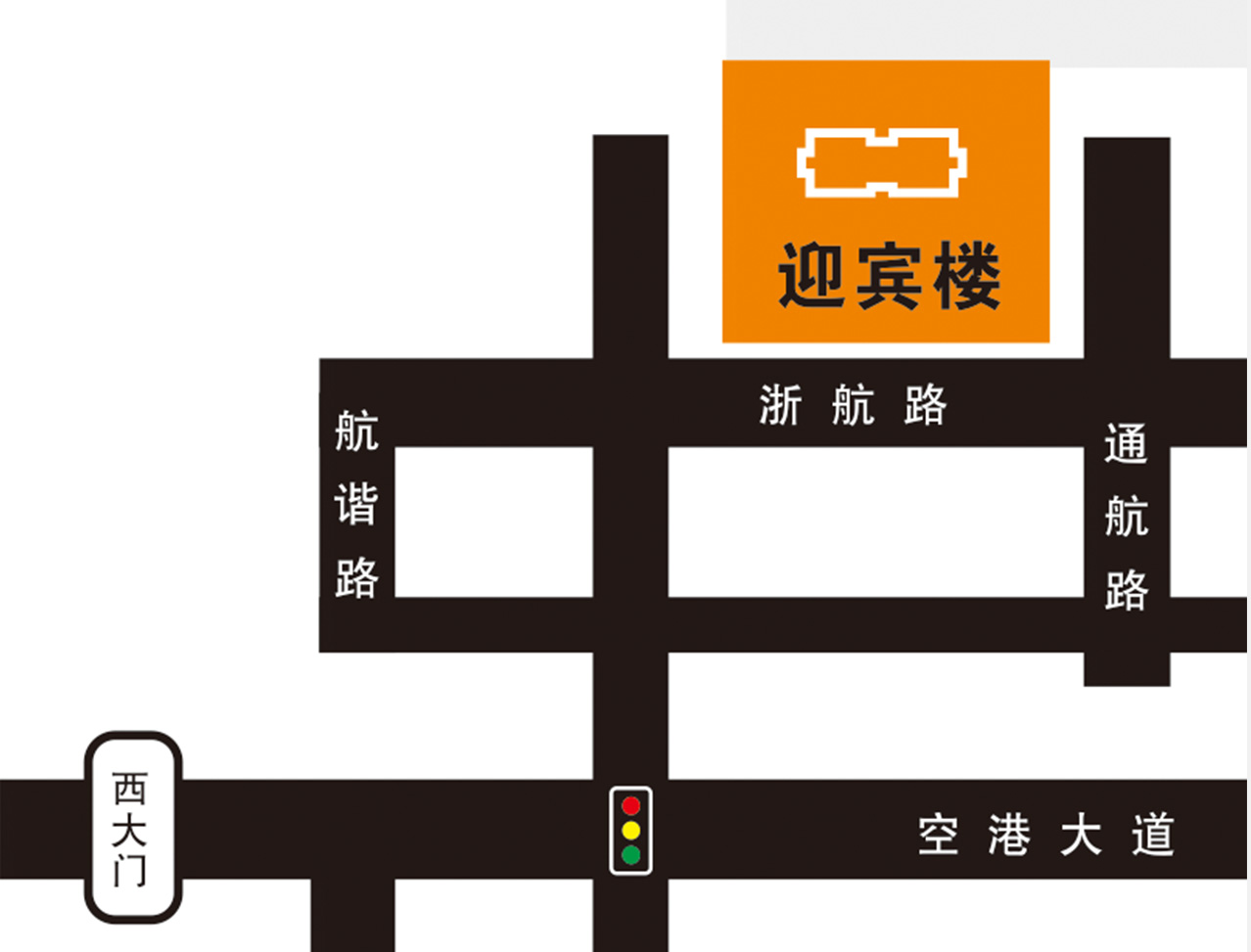 5、迎賓樓:進機場西大門后在第一個紅綠燈左轉上航安路,在第二個路口右轉上浙航路,迎賓樓位于左側。