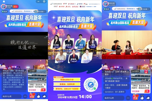 12月25日,杭州機場開展“喜迎雙旦,杭向新年”的線上直播營銷活動,聯動本場各大航司推出優惠航線產品,全力備戰2025,奪取首季“開門紅”。