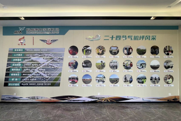 此次改造主要涉及安全宣傳和設備配置兩個方面。安全宣傳方面,飛行區中心全面更新了文化墻,以“24節氣”為主題,通過24張圖片結合24個節氣展示不同時期下的機坪運行特點及安全風險,拼成一條“時間走廊”。從夏季的防臺防汛到冬季的除冰雪,從春季的鳥類遷徙到秋季的低能見度運行,從春運到暑運,從高溫防暑到低溫保暖,實現安全教育的可視化場景滲透。
